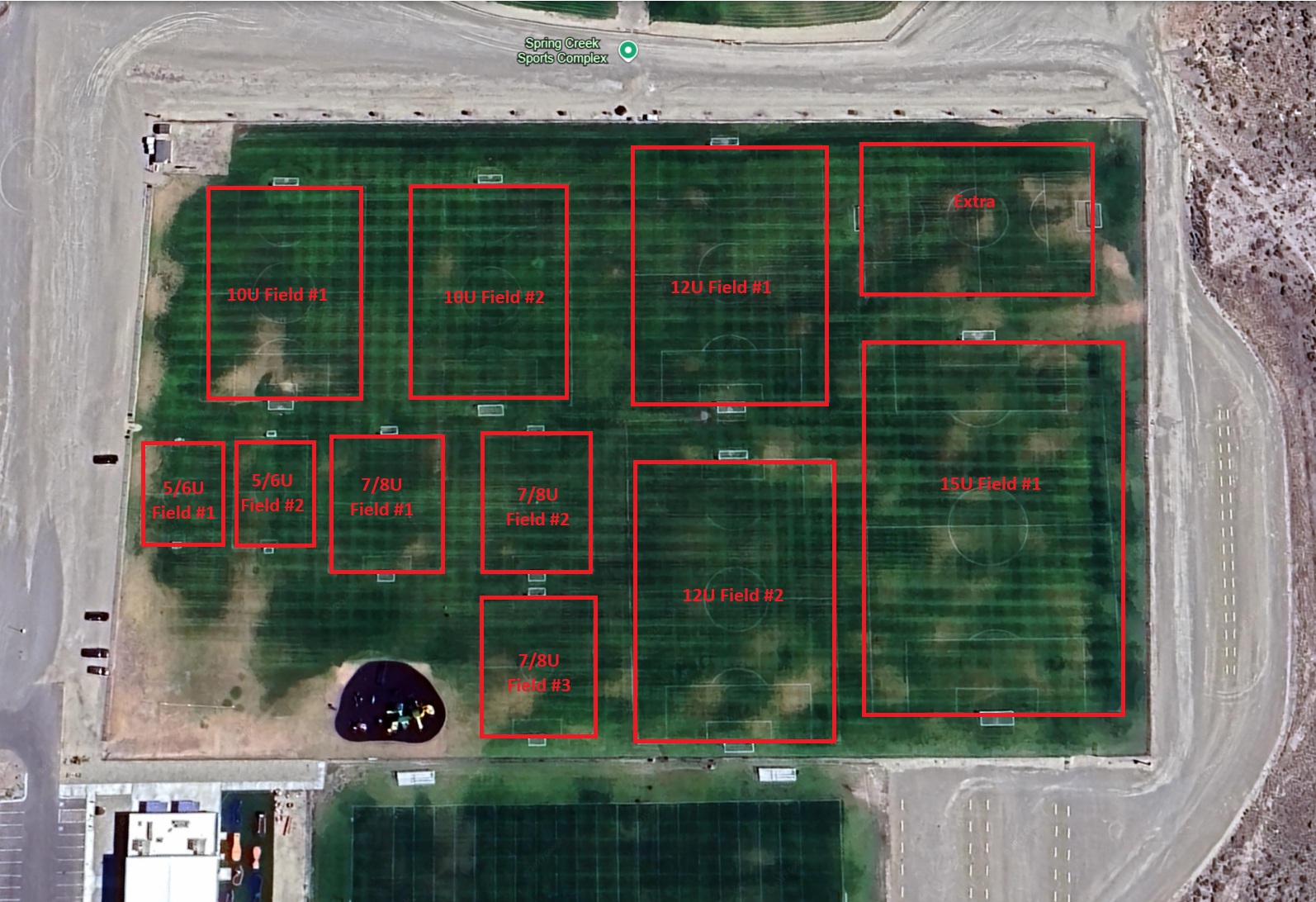 At the Roundabout, take your first right. Go past Spring Creek Elementary until you hit the Sports Complex on your left.